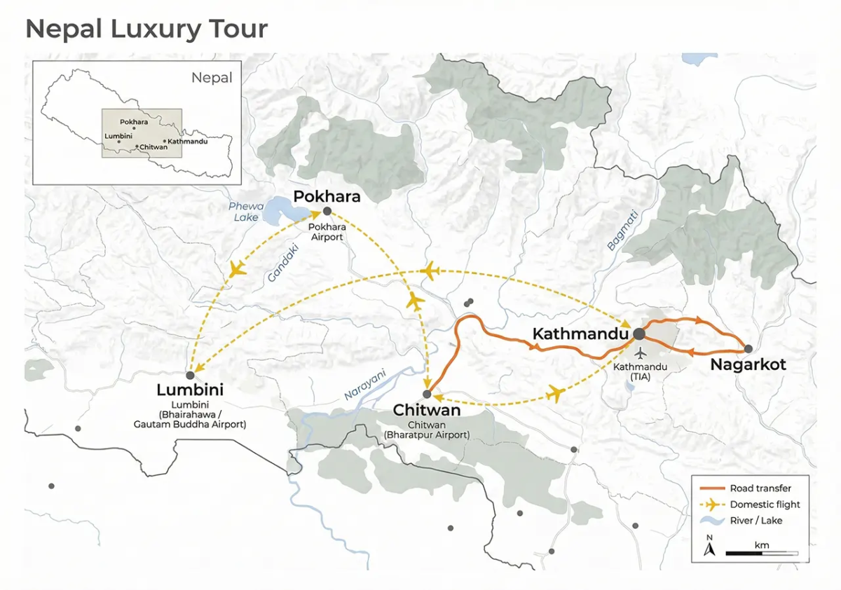 Note: These trip notes provide the most current information for this itinerary and may replace details in our current brochure, including itinerary and pricing. Please consider this itinerary as a guide. Changes may occur due to weather conditions, natural events, or circumstances beyond our control. Experience the perfect blend of culture, nature, and luxury on this Nepal Luxury Tour. We aim to make your luxury holidays in Nepal memorable and look forward to serving you again in the future.